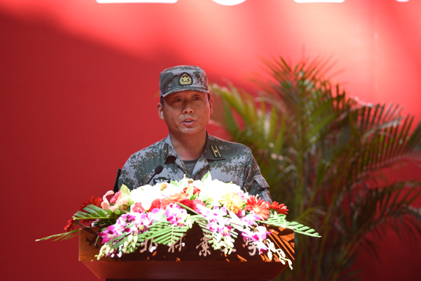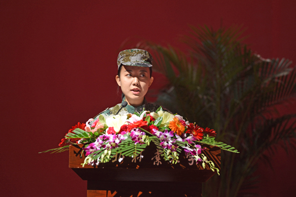 园林学院2017级张尧同学代表新生对军训生活做出承诺:提高国防意识,勇担青年重任;严格遵守纪律,一切行动听指挥;培养军人品质,巩固军训成果。