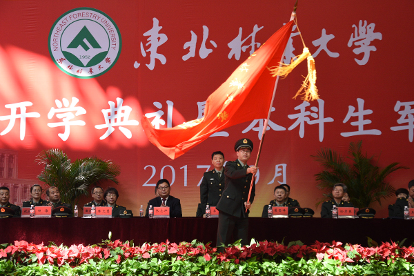 校长、军训团团长李斌向军训团授旗,军训团四营营长王晓光从军训团团长手中接旗。
