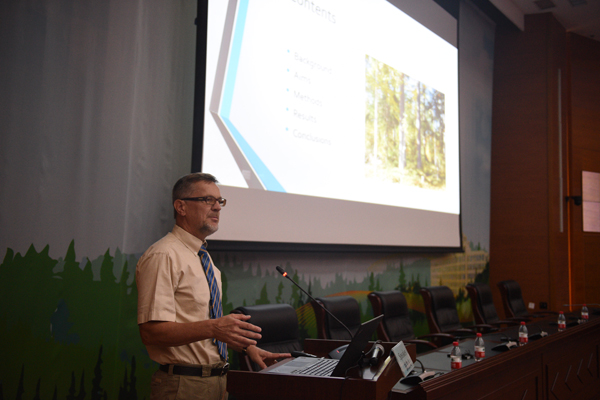 研讨会上,中国林科院副院长刘世荣教授、东荷兰大学蒂莫·普卡拉(Timo Pukkala)教授、西班牙国家农业与食品技术研究所斯文·穆特克(Sven R Mutke)教授、加拿大林业科学研究院罗恩·艾林(Ron Ayling)教授、我校王晓春教授、西孟加拉邦州立大学乔蒂什·普拉卡什·巴苏(Jyotish Prakash Basu)教授分别以《中国人工林的培育与管理》《针叶树还是阔叶树?》《全球变化背景下欧洲地中海地区意大利五针松生态系统可持续的多目标经营》《加拿大可持续的森林经营》《中国东北主要树种径向生长对气候迅速暖化的响应》《关于印度西孟加拉邦易遭旱灾区域森林社区的研究》为题作了报告。