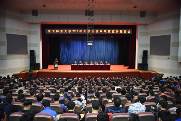 4月17日下午,东北林业大学2017年大学生征兵政策宣讲报告会在我校科学会堂举行,黑龙江省军区副司令员刘文东少将、校长杨传平、哈尔滨警备区政治委员曲升云大校、黑龙江省军区军训办主任赵汝亮大校、哈尔滨警备区政治部主任王勇男大校、黑龙江省教育厅高校学生处处长高铁春,在哈高校及哈尔滨市各区县武装部负责人,各学院学生工作负责人、学生代表出席报告会,报告会由学校党委副书记蔺海波主持。