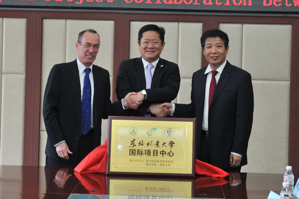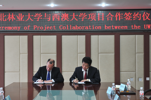 李斌副校长与万胤忠副校长共同签署了合作协议,并与澳大利亚教育管理集团总裁李新庆共同为“东北林业大学国际项目中心”揭牌。