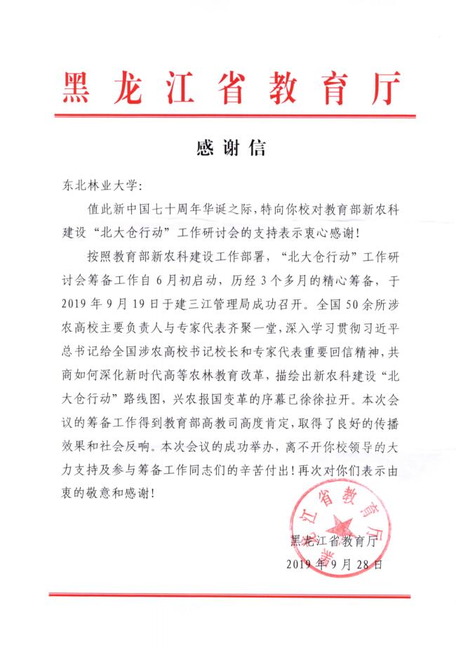 近日,省教育厅向我校发来感谢信,感谢我校对教育部新农科建设“北大仓行动”工作研讨会的支持。